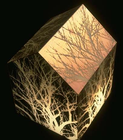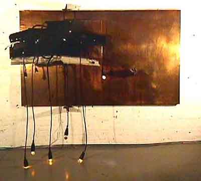 RON ROCCO’s “Work on What Has Been Spoiled” a mixed media piece comprised of cardboard, Plexiglas, photo-etched copper and artificial light, is the exhibition’s most potent piece.