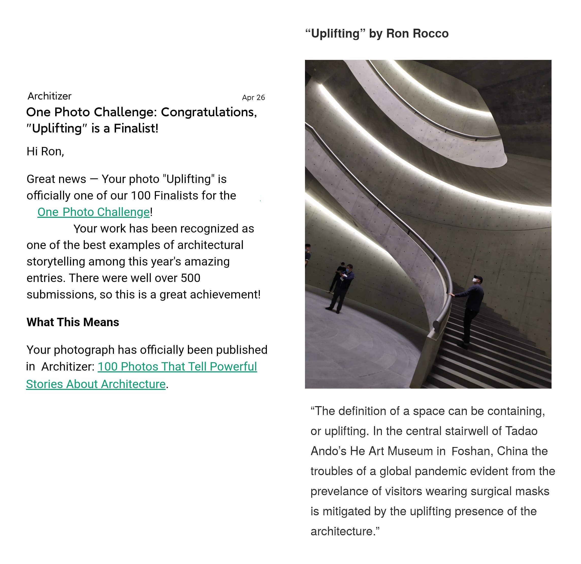 I am pleased to announce that my photo titled 'Uplifting' made it as a Finalist for the Architizer's Prize for photos of architecture that tell a story about current events in society. I am excited it got this far.