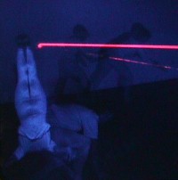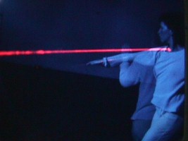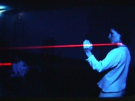 | LASER SCULPTURE/DANCE as conceived, as a dance and sculpture collaboration, employs a set environment of laser and artificially induced fog atmosphere containing reflective target points for the direction of the laser light into string-like patterns. | ![]() | |